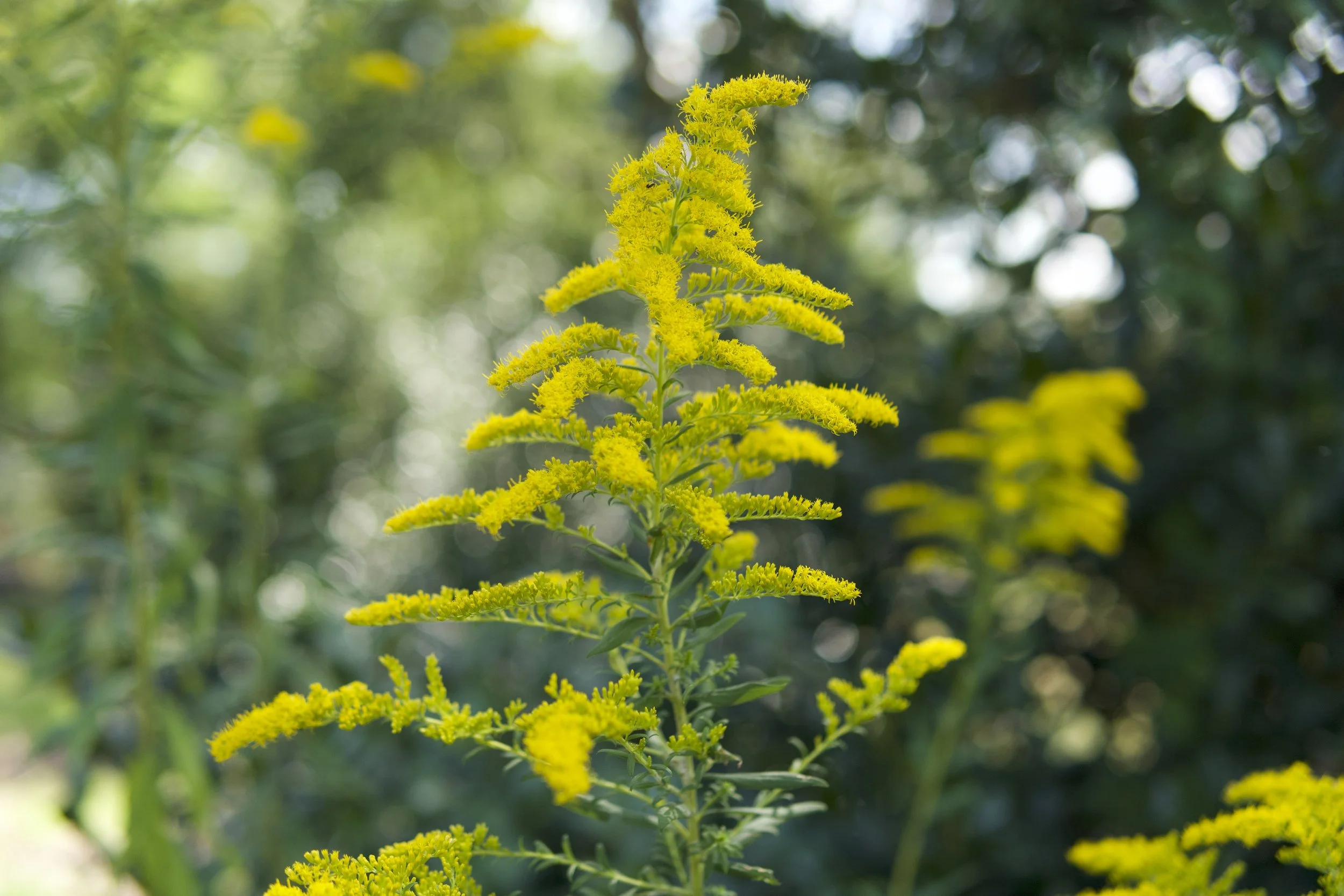 Botanical ID: Tall, slender stems topped with plume-like clusters of small, golden-yellow flowers that bloom from late summer into fall. Leaves are alternate, lance-shaped, and finely toothed, with a slightly hairy underside. Stems are unbranched until the flowering panicle forms at the top.